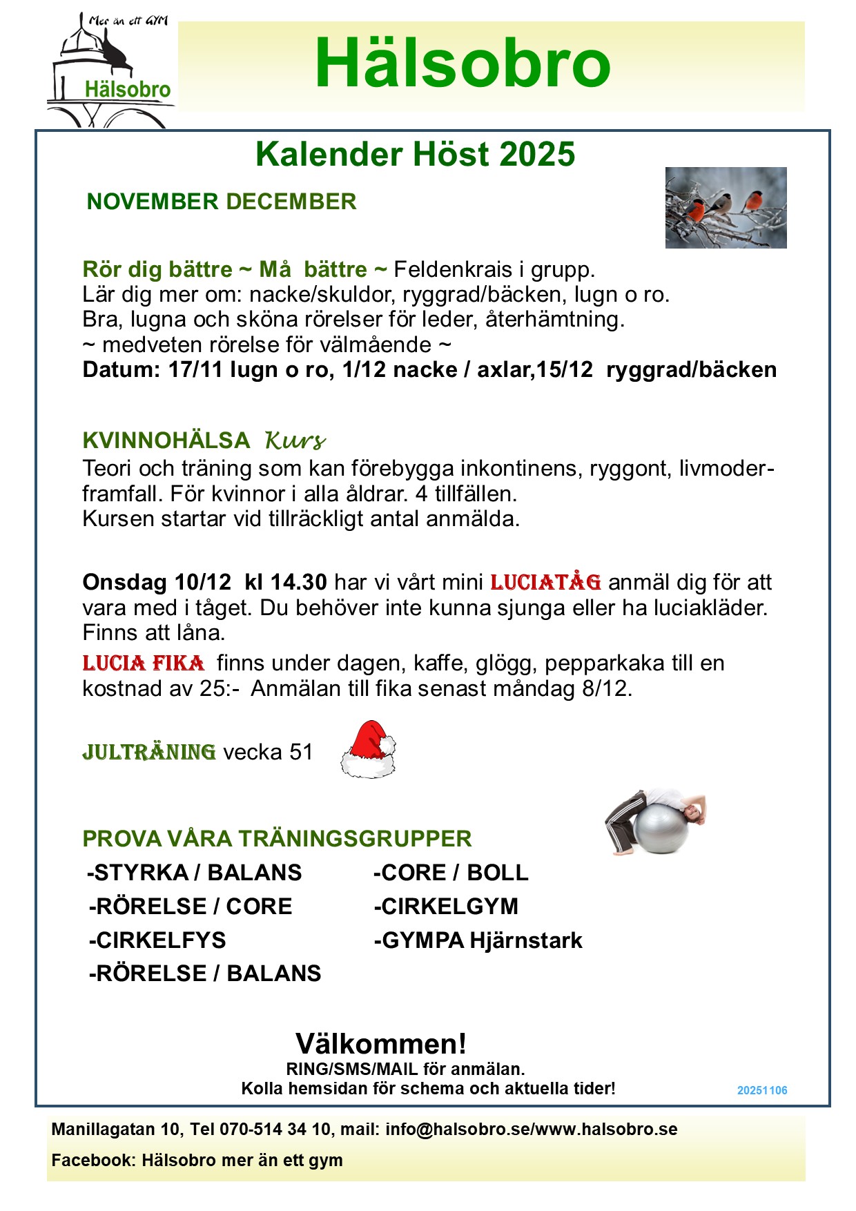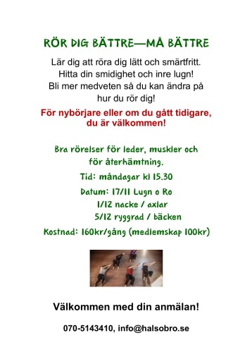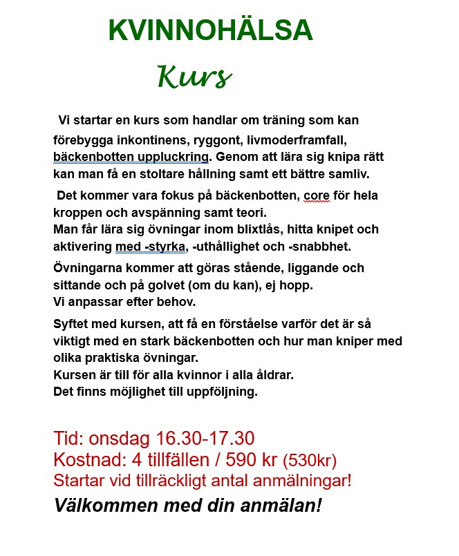 - Kvinnohälsa - kurs för kvinnor i alla åldrar förebyggande och stärkande övningar, bäcken-bottenträning, core, avspänning.