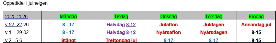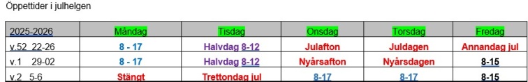 Ordinarie öppettider: måndag -torsdag 8-19, fredag 8-15
