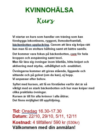 Kvinnohälsa Kurs; Förebyggande- och uppbyggande träning som kan stärka och förebygga inkontinens, ryggont, livmoderframfall och bäckenbotten uppluckring.