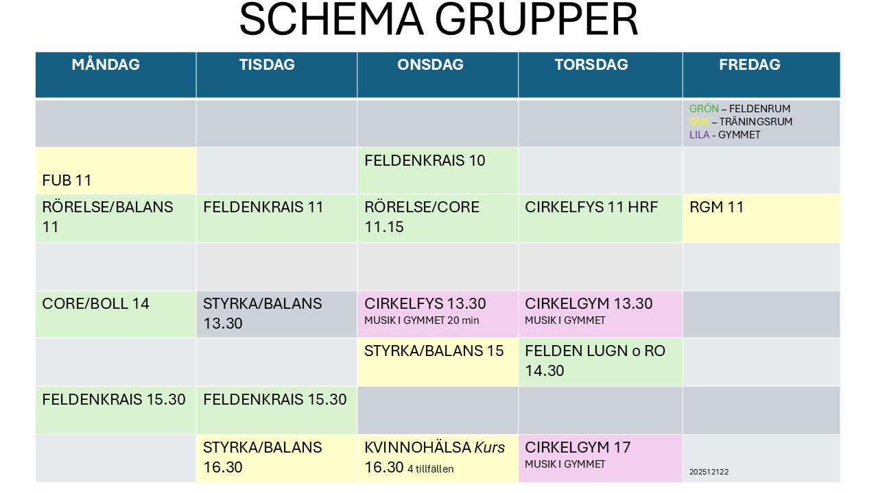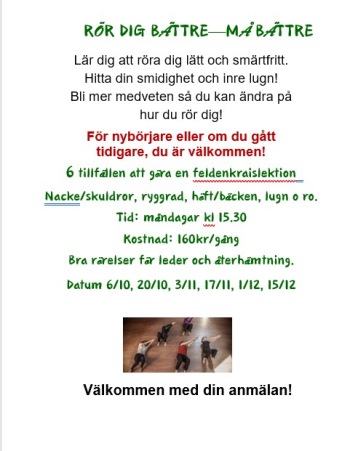 Feldenkrais kurs; En mjuk metod som möjliggör förändringar i rörelsemönster och utvecklar medvetenhet. Kan leda till avspänning, ökad rörlighet, bättre koordination hållning och balans förbättras.